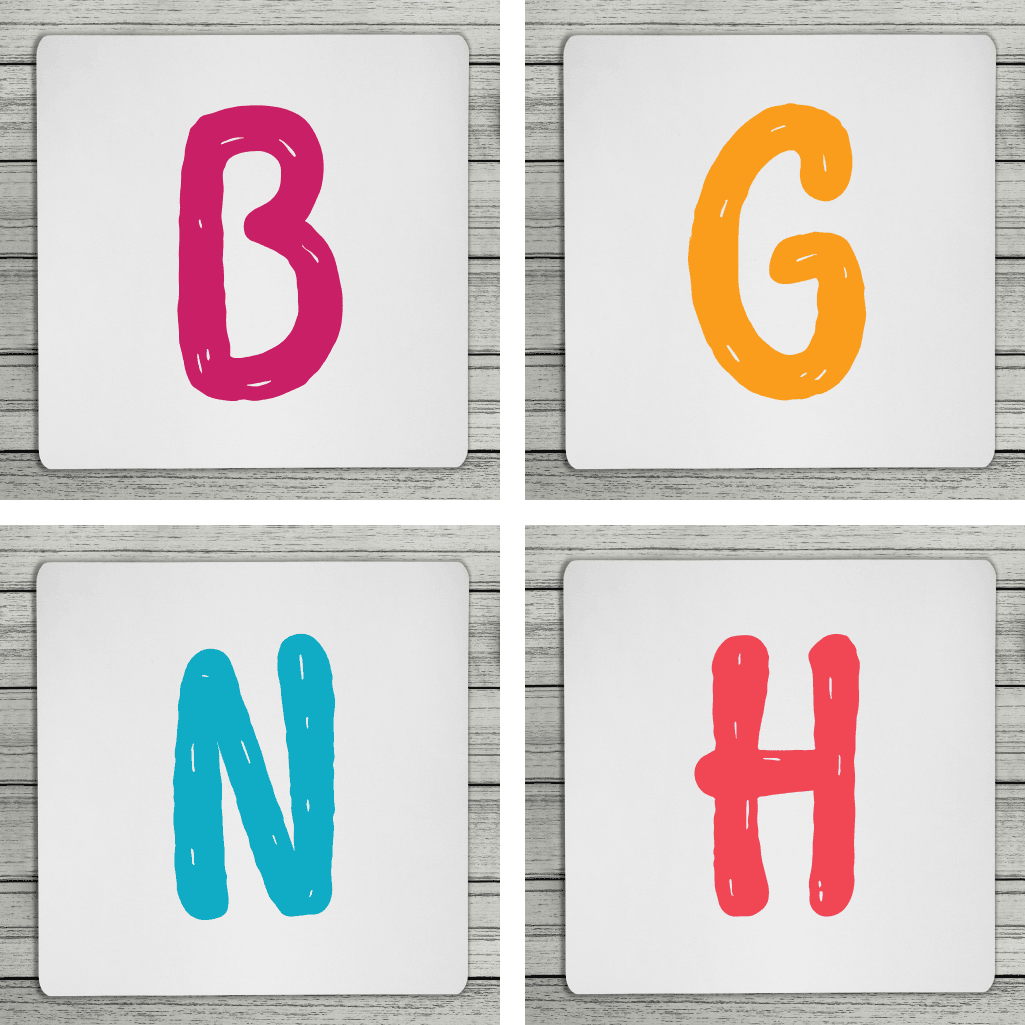 A bright and cheerful coaster, personalised with a simple initial in a bright and bubbly font in a selection of vibrant colours.