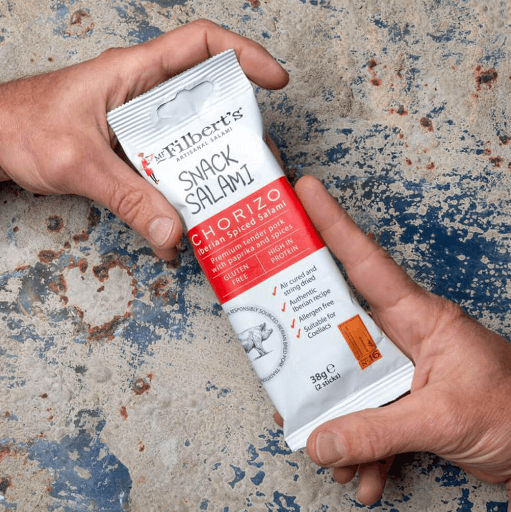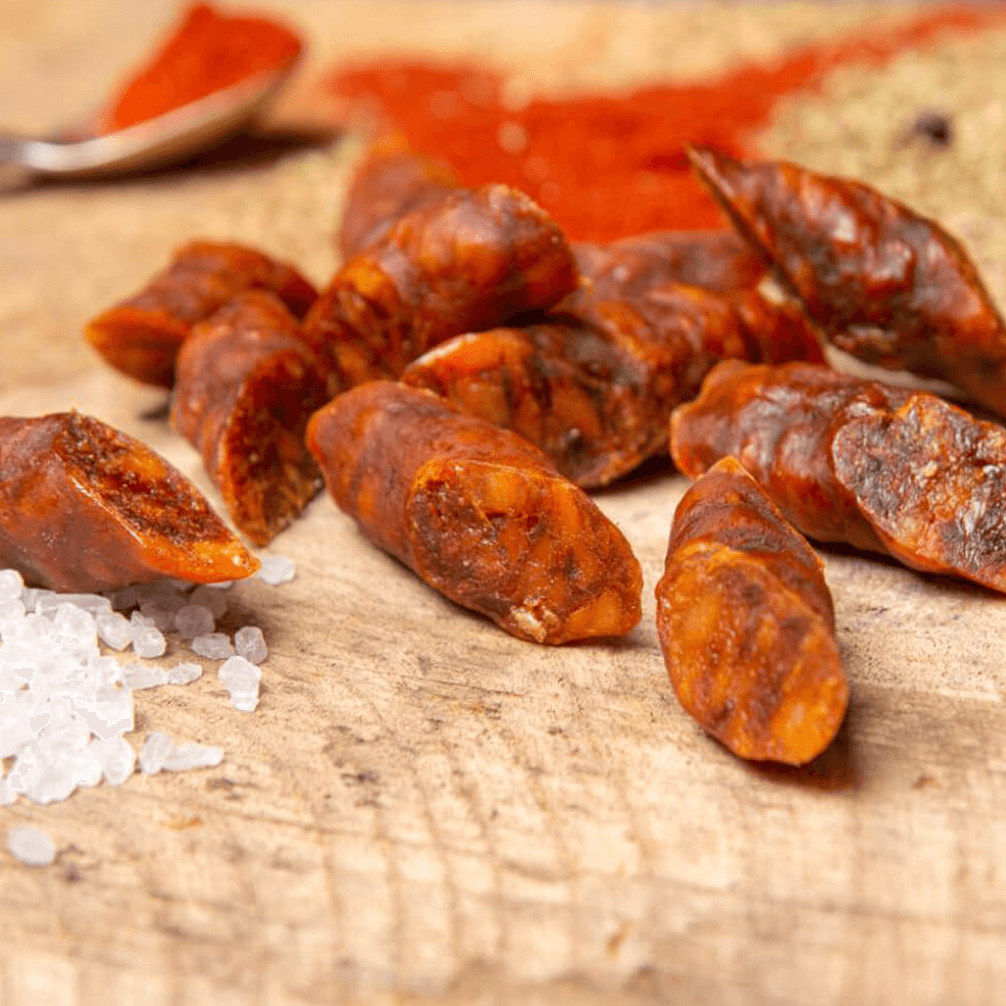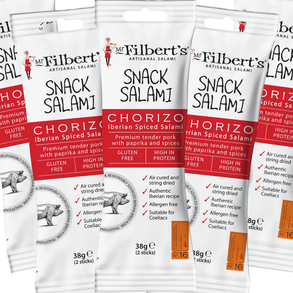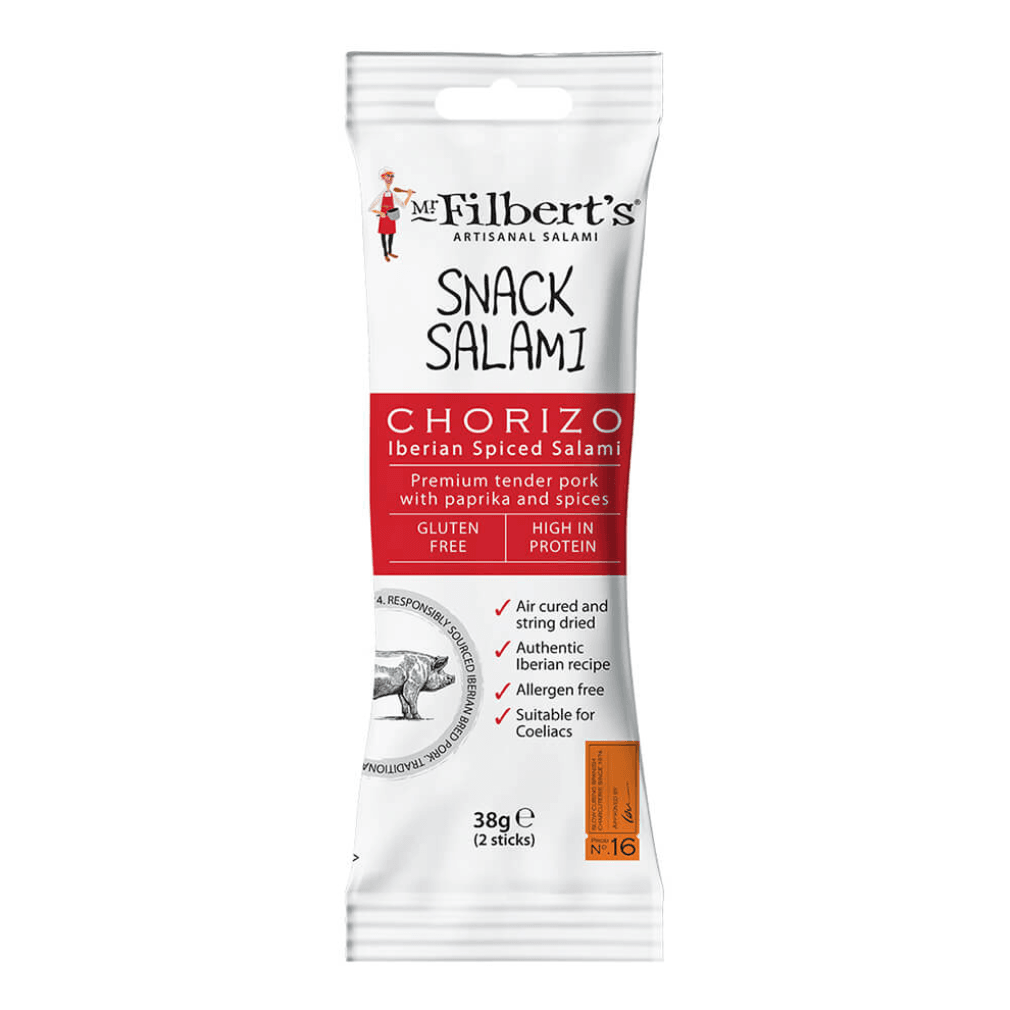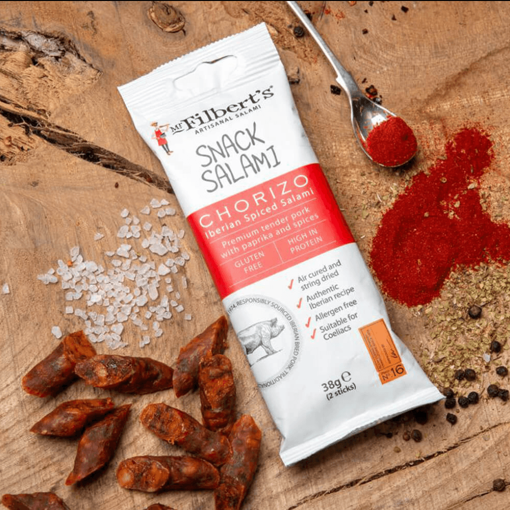 A snack size meaty treat, this Chorizo snack salami is shot through with the finest Paprika giving it a sweet smokey flavour. Naturally cured to produce an authentic Iberian snack, it’s high in protein, low in sugar and completely sugar free.