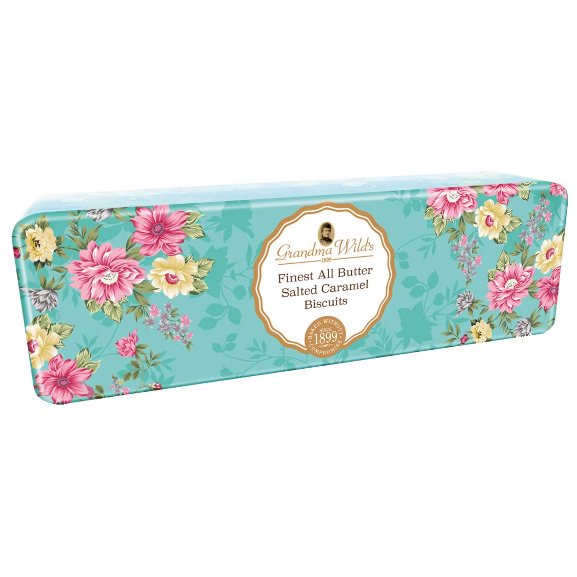 A beautiful floral tin filled with our all butter salted caramel biscuits; a perfect combination of sweet, buttery biscuits with salty caramel pieces.