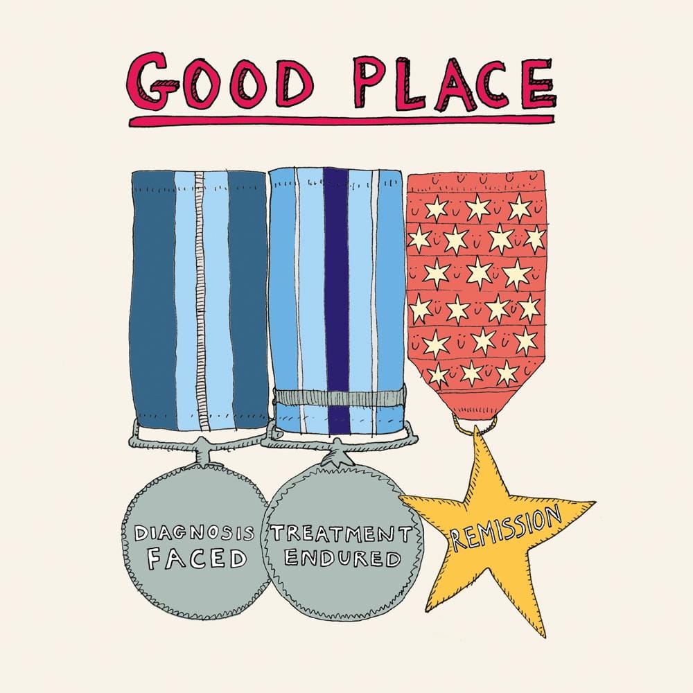 The text on the front of the card reads: ‘Good Place – Diagnosis Faced – Treatment Endured – Remission’