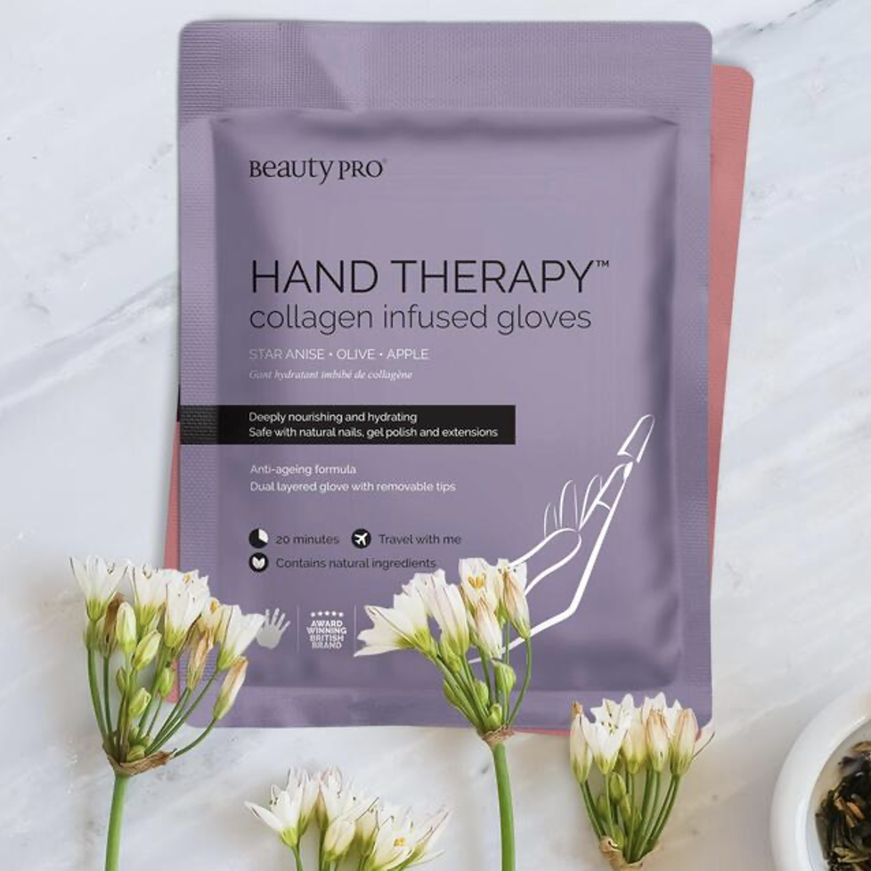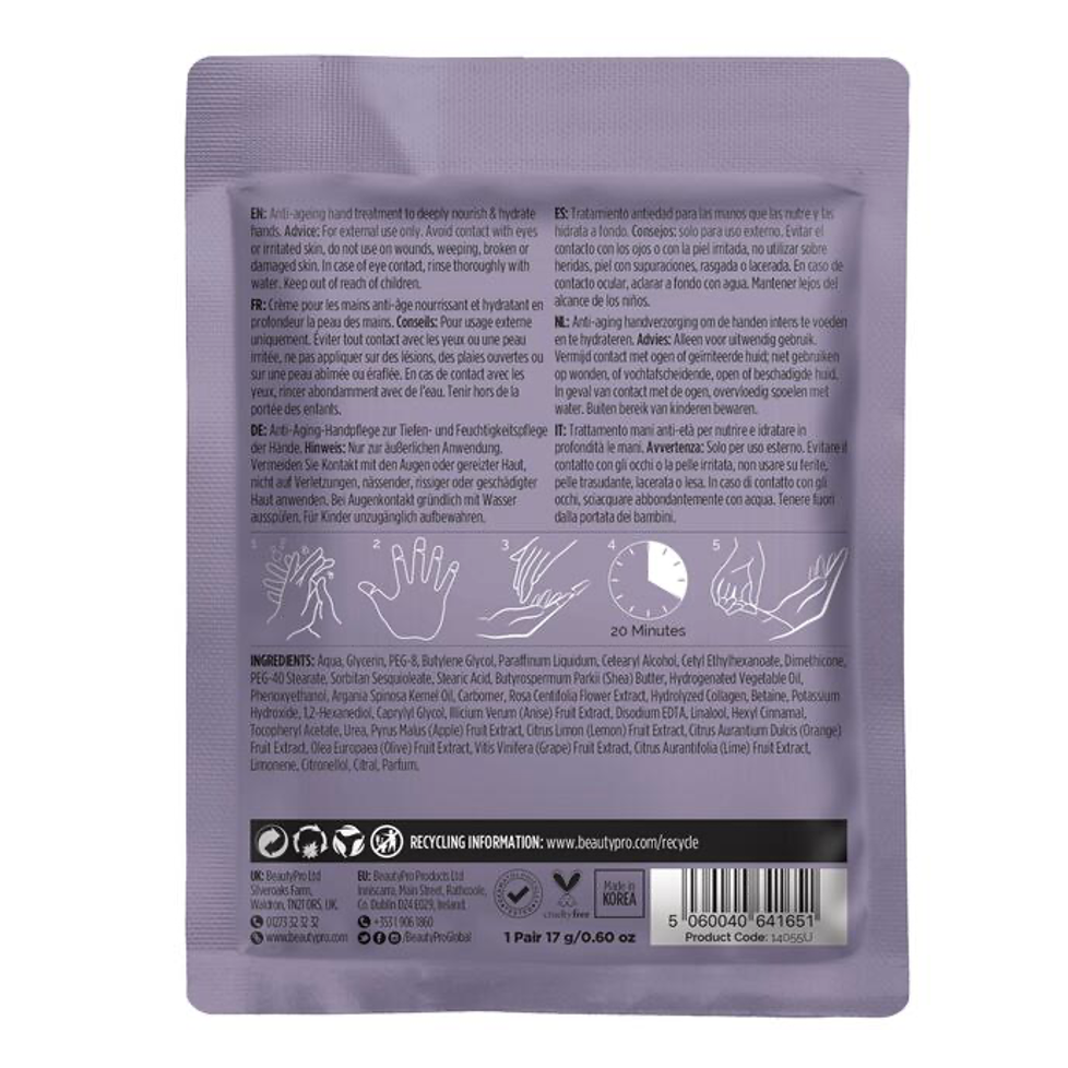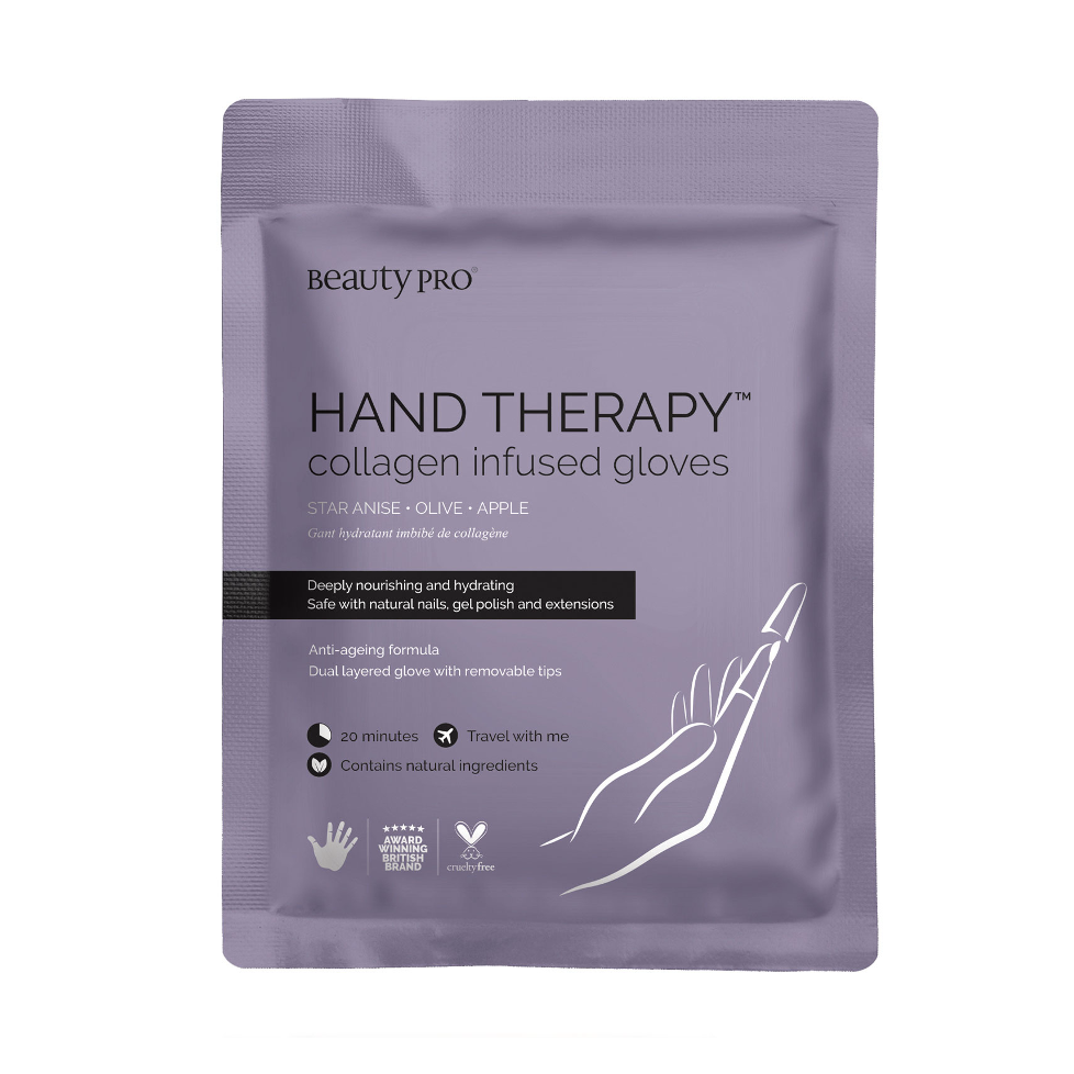 The BeautyPro Hand Therapy Collagen Infused Glove with Removable Fingertips is a dual layered anti-ageing treatment glove that is combined with marine collagen and fruit extracts to nourish and deeply moisturise the hands.
