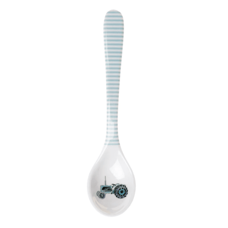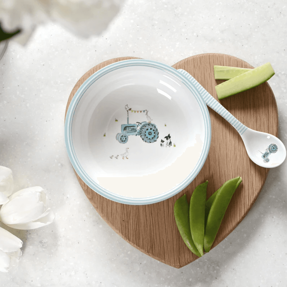 The bowl features gorgeous illustrations of sheepdogs, runner ducks, a chicken and a tractor, and the spoon cradles a bite-sized tractor in its bowl, both are finished with a perfect stripy blue edging.