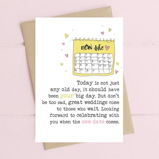 The text on the front of the card reads: ‘Today is not just any old day, it should have been your big day. But don’t be too sad, great weddings come to those who wait. Looking forward to celebrating with you when the new date comes’.