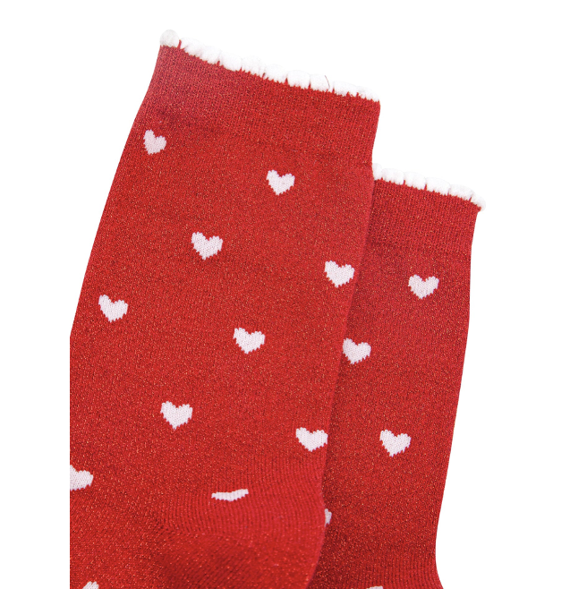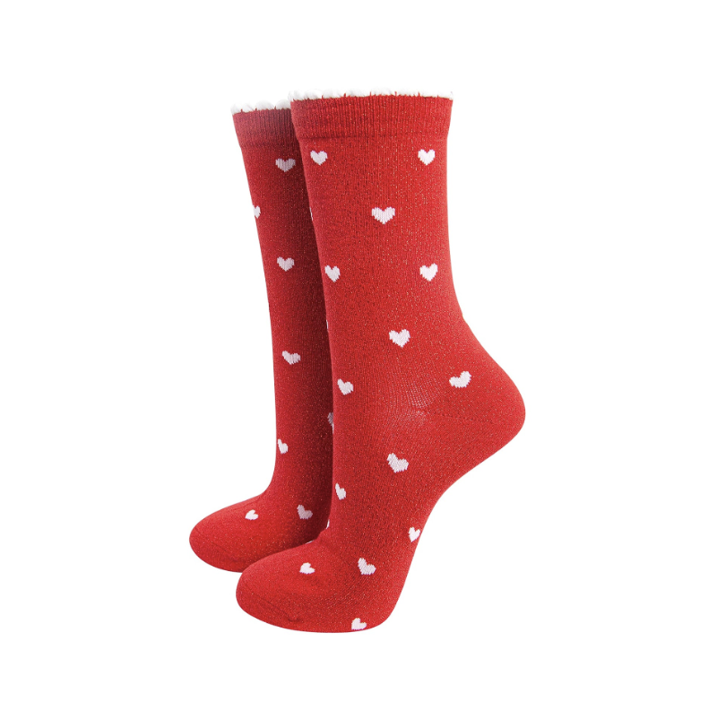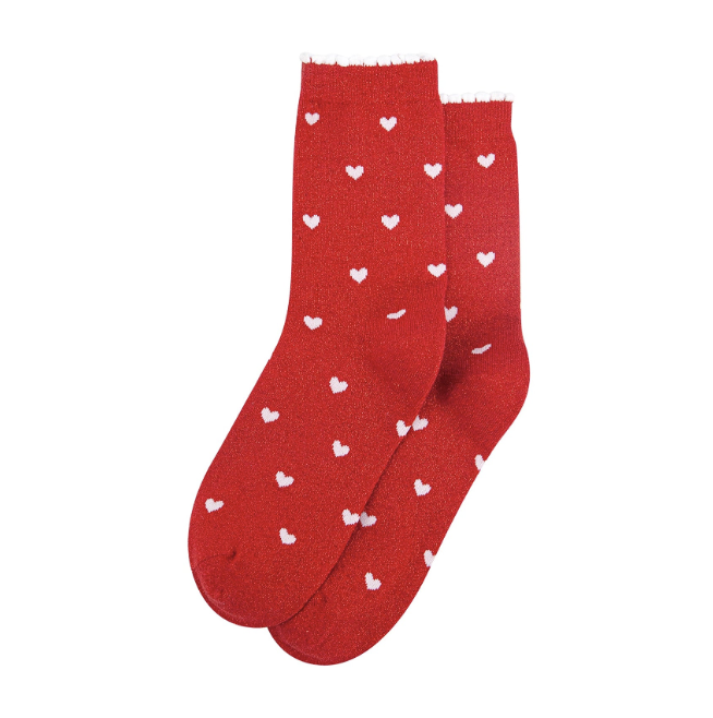 - Red – Red socks with a white love heart pattern and en eye-catching red sparkle.