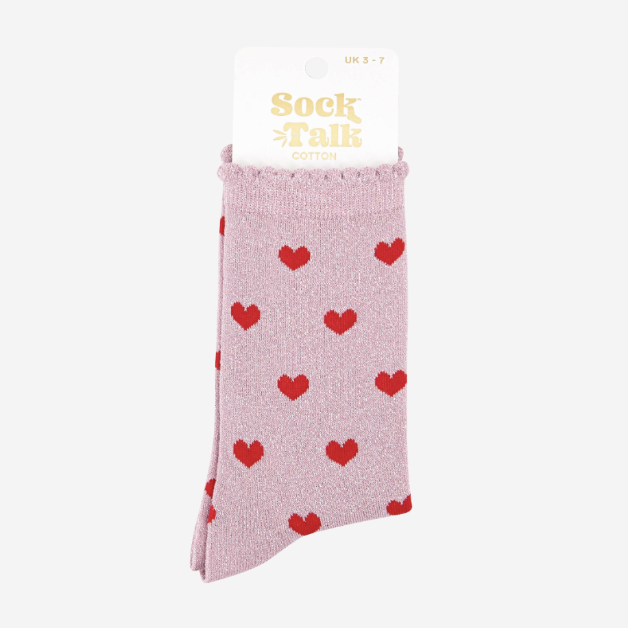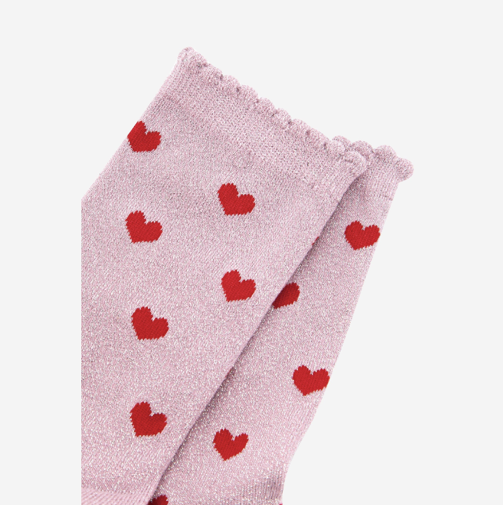 Designed in the UK, these glitter socks are crafted from soft blended cotton. Pink socks with a red love heart pattern and an eye-catching silver sparkle. Naturally breathable with a scalloped edge. One size fits all: 3-7 UK.