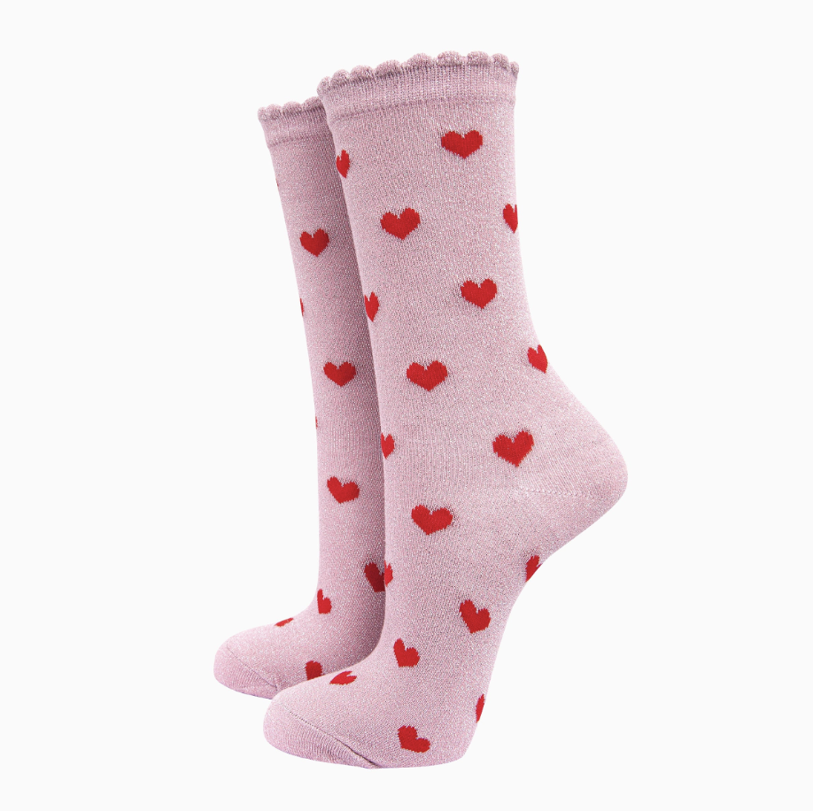 - Pink – Pink socks with a red love heart pattern and an eye-catching silver sparkle.